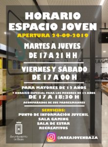 Hoy comienza la temporada de apertura en el Espacio Joven de la calle Zapatería. Los más jóvenes estarán esperando esta noticia, ya que después de un mes de parón en el espacio joven, este viernes vuelve a estar operativo para el disfrute y entretenimiento de los jóvenes bastetanos.