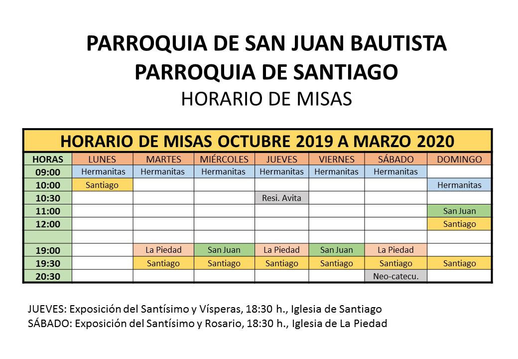 Las parroquias de Santiago y San Juan dan a conocer su nuevo horario de misas. Un horario que estará vigente desde el mes de octubre de 2019 hasta el mes de marzo de 2020 y que queda tal y como se expone en el siguiente cuadro: