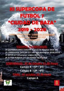 Por otro lado, recordamos que la XI Supercopa de Fútbol 7 “Ciudad de Baza” 2019-2020 se disputará finalmente el 7 de octubre, en el campo de hierba artificial de La Alameda, con la participación de los ganadores de los torneos disputados en la temporada anterior, que se enfrentarán en las semifinales y final.