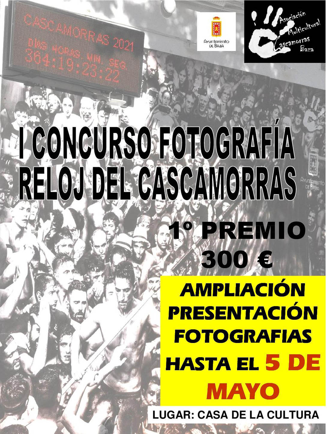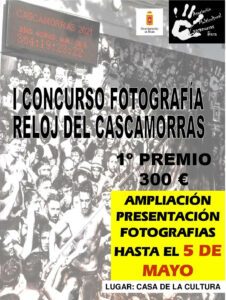 Prorrogados los plazos para los concursos de fotografía de la A.M. Cascamorras Baza. La Junta directiva de la Asociación Multicultural Cascamorras Baza, ante una serie de circunstancias acaecidas, amplia la fecha de presentación de fotografías para el I Concurso de Fotografía Imagen Reloj del Cascamorras hasta el viernes 6 de mayo de 2023, recordando que deberán reflejarse en las imágenes cualquier momento de la carrera del Cascamorras 2022, debiendo aparecer de manera principal la figura del Cascamorras encarnado por José Antonio Escudero García.