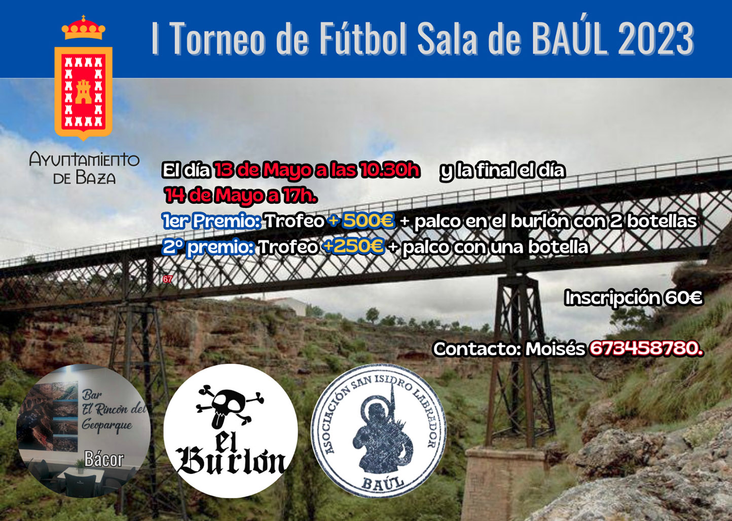 Abierta la inscripción para el Torneo de Fútbol Sala de Baúl, coincidiendo con las fiestas tradicionales de este anejo bastetano. El final de la primera quincena del mes de mayo es tiempo de fiestas patronales en el anejo de Baúl, las cuales se celebrarán durante los días 12, 13 y 14 de mayo, en honor a San Isidro y la Virgen de Fátima, para lo que contarán con un amplio programa de actividades festivas que daremos a conocer en los próximos días.