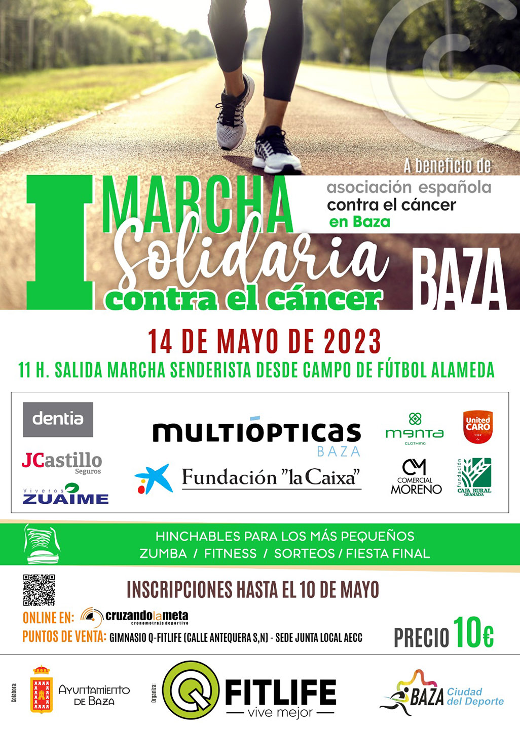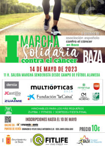 La AECC bastetana organiza la I Marcha Solidaria Contra el Cáncer Baza el próximo 14 de mayo. Baza acogerá el próximo 14 de mayo la I Marcha Solidaria Contra el Cáncer, organizada por Q-Fitlife Baza y el Ayuntamiento bastetano, a beneficio de la Asociación Española Contra el Cáncer. La marcha tendrá un recorrido urbano de unos 4 kilómetros por diferentes calles del municipio con salida y llegada al campo de fútbol de la Alameda y con horario de salida a las 11.00h de la mañana.
