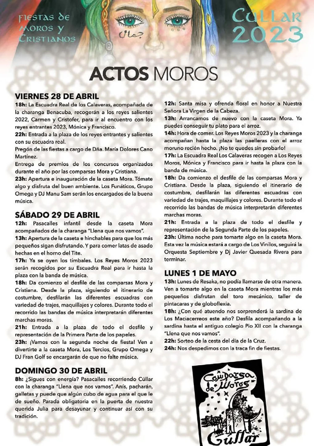 - 22:00 h.: Confraternización de Comparsas en la piscina municipal con música festera e invitación. Las comparsas estarán cerradas.