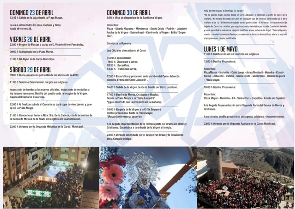 - 20:00 h.: Representación obra “Cautiverio y Rescate de Ntra. Sra. la Virgen de la Cabeza” (parte 2), en la Plaza Mayor
