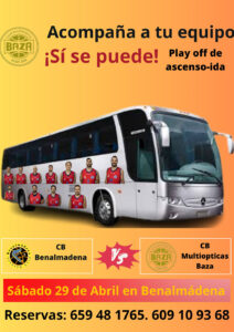 El Multiópticas Baza viaja a Benalmádena para disputar la ida del play off de ascenso a Liga EBA, con plazas de autocar disponibles para los aficionados. Tras la gran segunda vuelta realizada por el Multiópticas CB Baza, dejándose sólo un partido en Vera y que ha hecho poder disfrutar de una eliminatoria de ascenso con la vuelta en nuestra ciudad, toca ahora rendir visita a uno de los equipos del grupo más fuerte de Andalucía, como es el de Málaga y Córdoba.