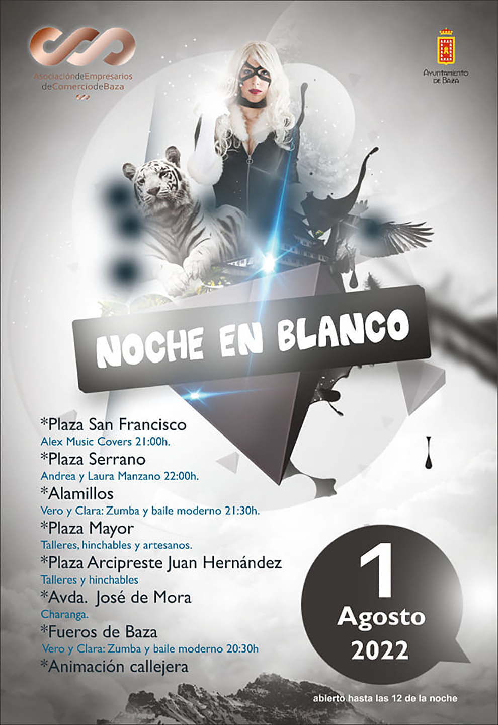 El próximo lunes, 1 de agosto, vuelve a Baza la “Noche en blanco”. El mes de agosto comienza con una de las exitosas actividades que se han venido celebrando en nuestra ciudad en los últimos años, como es el caso de la “Noche en blanco”, en lo que siempre han colaborado el Ayuntamiento de la ciudad y la Asociación de Empresarios de Comercio, algo que vuelve a ser así en esta ocasión.