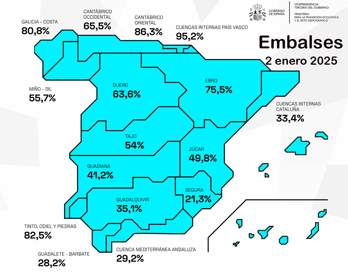 Un segundo grupo de cuencas están entre el 30 y el 60% de su capacidad: Miño-Sil al 55,7%, Tajo al 54%, Júcar al 49,8%, Guadiana al 41,2%, Guadalquivir al 35,1% y Cuencas internas de Cataluña al 33,4%.