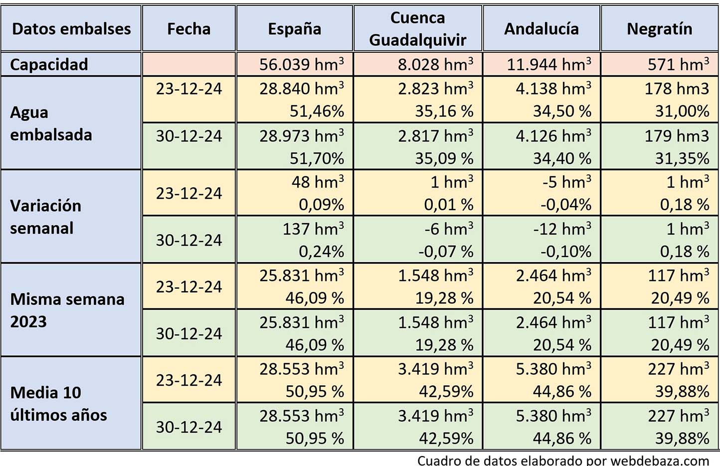 La reserva hídrica española se encuentra al 51,7% de su capacidad, equivalentes a 28.973 hectómetros cúbicos, en una semana de poca pluviosidad. La reserva hídrica española está al 51,7% de su capacidad total, con los embalses almacenando, a fecha del 30 de diciembre de 2024,  28.973 hectómetros cúbicos (hm³) de agua, aumentando en la última semana en 137 hm³ , lo que supone un aumento del 0,2 % de la capacidad total.
