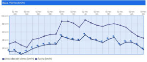 El viento alcanzaba ayer en Baza los 55 km/h y se registraron rachas entre los 80 y los 95 km/h entre las diez de la mañana y las tres y media de la tarde. El viento se dejaba notar ayer en Baza, sobre todo entre las diez de la mañana y las siete de la tarde, cuando se alcanzó la máxima velocidad prevista de 55 km/h, a las dos del mediodía, pero coincidiendo con esa franja horaria, hubo rachas que alcanzaron los 95 km/h, a las dos de la tarde, y que superaron los 80 km/h. entre las diez de la mañana y las tres de la tarde, como se puede ver en el gráfico adjunto.