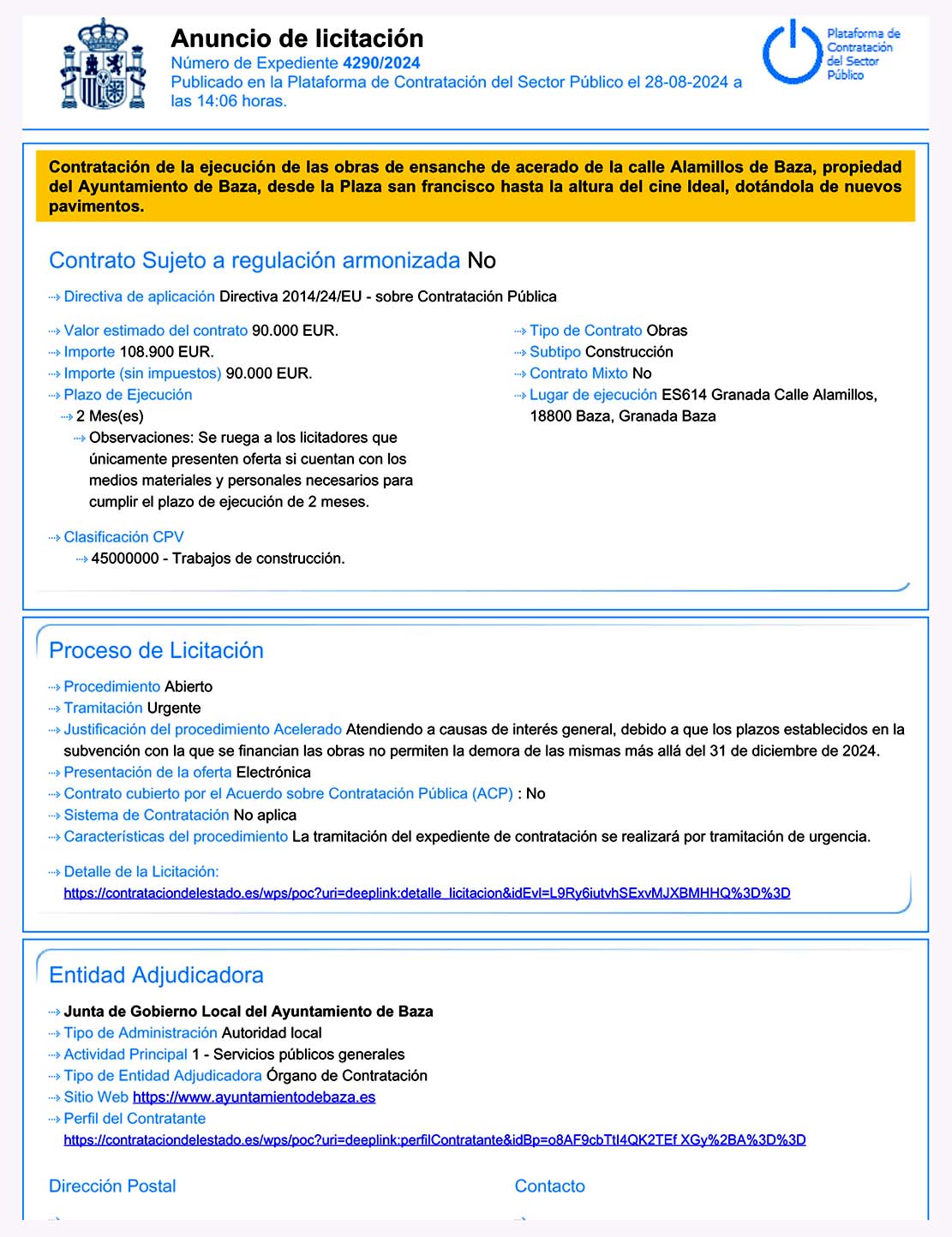 Salen a licitación las obras de ensanche del acerado en la calle Alamillos a la que se pueden presentar ofertas hasta el 12 de septiembre. La Plataforma de Contratación del Sector Público tiene ya publicado el anuncio de licitación que rige la adjudicación de la ejecución de las obras de ensanche de acerado de la calle Alamillos, en concreto del tramo que transcurre entre la Plaza de San Francisco y el cine Ideal, dotándola de nuevos pavimentos. El presupuesto base de licitación es de 90.000 euros más IVA.