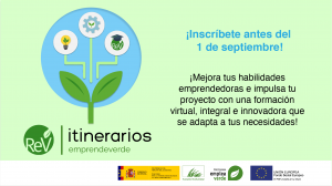 Itinerarios Emprendeverde es un servicio gratuito y online de formación y experimentación especializado en el emprendimiento verde, del que podrán beneficiarse más de 200 personas en 2021. Quienes participen tendrán la oportunidad de desarrollar su idea de negocio de la mano de un equipo de formación, de entidades con amplia experiencia y con el apoyo de la REV, que se ha posicionado como la mayor red de emprendimiento verde en España, y que cuenta ya con cerca de 10.000 personas.
