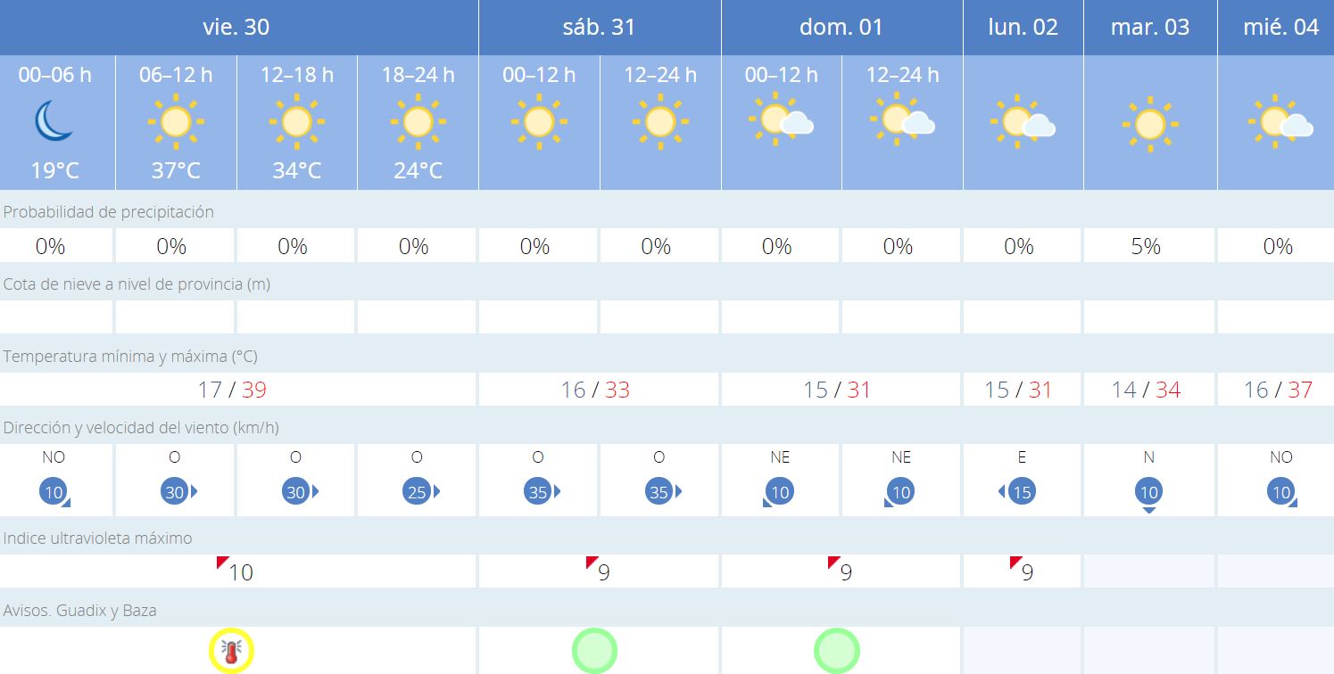 Nueva alerta amarilla para hoy en Baza con unas temperaturas previstas de entre 17 y 39ºC antes de unos días de respiro que empezarán el sábado 31. Las predicciones de AEMET nos auguran una nueva jornada de calor para hoy, con máximas de 39 grados y mínima de 17ºC.