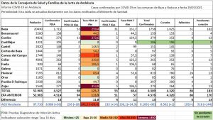 En las comarcas de Baza y Huéscar siguen creciendo los contagios que, día a día, añaden nuevos casos. Así se desprende de los datos que ofrece la Consejería de Salud de la Junta de Andalucía que en el día de ayer añadían 8 casos a Baza, 2 a Cúllar, 3 a Zújar y uno a cada municipio de los siguientes: Benamaurel, Castril y Freila, municipios que, excepto en el caso de Benamaurel, han visto crecer sus tasas de incidencia.