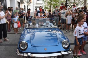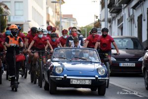 Después se acomodaron en el descapotable de época y realizaron el recorrido anunciado que fue esperado por el vecindario de las calles de su itinerario, donde pudimos ver a personas que ya lo esperaban en sus balcones y en las puertas de sus casas, provistas de banderas que agitaban mientras jaleaban el paso del ciclista y de los varios cientos de bicicletas que le acompañaban.