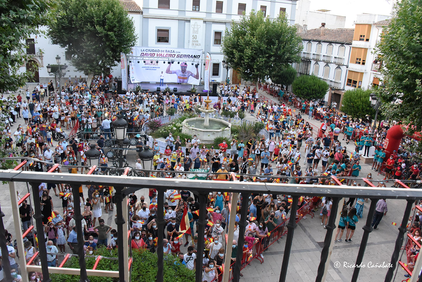 A continuación los actos pasaron al escenario instalado ante el actual Ayuntamiento, al que fueron accediendo las autoridades encabezadas por el delegado del Gobierno de España en Andalucía, Pedro Fernández Peñalver, la delegada de Agricultura de la Junta de Andalucía, Mª José Martín; la representante de la Fundación Andalucía Olímpica, María de Nova P.; el diputado provincial de Deportes, Manuel Guirado; el alcalde bastetano, Manolo Gavilán; y el vicepresidente de la Federación Española de Ciclismo, Manuel Rodríguez García, quienes fueron dedicando unas palabras al ciclista bastetano ensalzando su hazaña deportiva y felicitando al pueblo de Baza por la forma en la que había respondido en este acto.