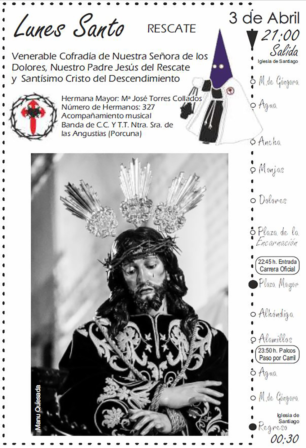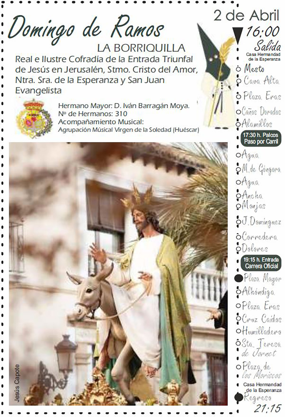 A continuación ofrecemos las tres primeras salidas que tendrán lugar hoy viernes, el Domingo de Ramos y el Lunes Santo, recomendando que se clique sobre las imágenes para aumentar su tamaño y poderlas leer más fácilmente.