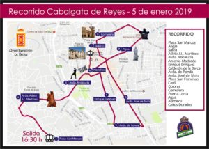 Se mantendrá el formato del año pasado, con salida a las 16.30, desde el Divino Maestro, y llegada a los Caños Dorados, desde donde los Reyes irán a pie hasta llegar al edificio del antiguo ayuntamiento. Allí, dirigirán unas palabras a los pequeños y grandes que les esperan en la Plaza Mayor, desde el balcón del antiguo Ayuntamiento. Tras su breve intervención, se podrá disfrutar de los fuegos pirotécnicos y un espectáculo musical. Los Reyes también tendrán tiempo para recibir a todos los niños y niñas y entregarles unas bolsas de chucherías.