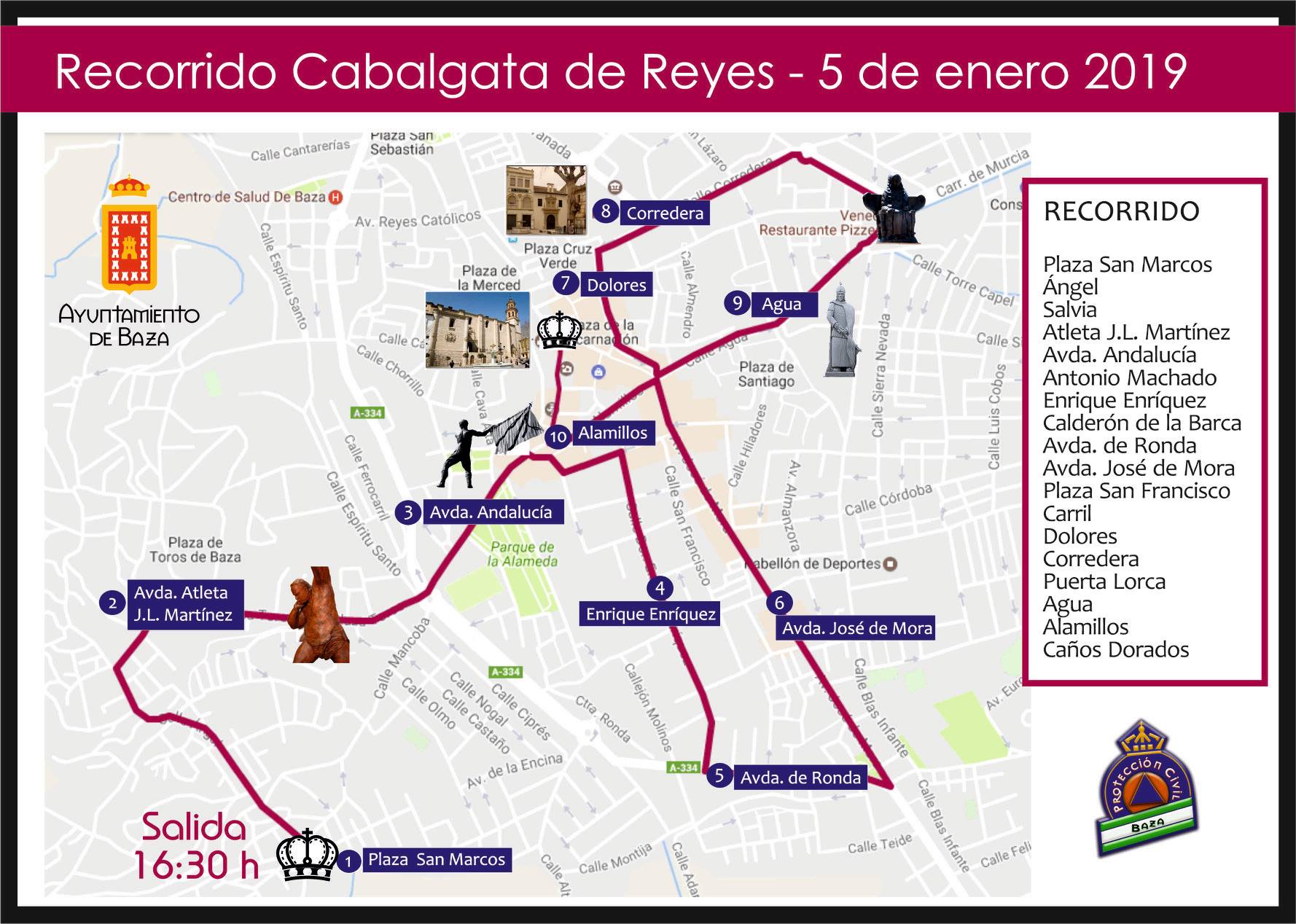 La cabalgata discurrirá por el mismo itinerario del año pasado y será preciso cortar el tráfico y velar por la seguridad, para lo que se ha organizado un dispositivo especial de seguridad compuesto por la Policía Local y Voluntarios de Protección Civil de Baza. Se pide especial colaboración a los ciudadanos, tanto a los que usen durante la tarde del día 5 el vehículo, como a los asistentes a la cabalgata, para que el desfile transcurra con total normalidad y se pueda disfrutar por todos los asistentes. Por eso se ruega que no se ocupen las zonas de la calle Agua y Dolores donde se estrecha el paso para carrozas, que los adultos tengan especial cuidado con los niños y niñas y no les dejen ocupar la calzada al paso de las carrozas y que establezcan puntos de encuentro con los pequeños en caso de despiste. Por otro lado, a los conductores que respeten el corte parcial de tráfico que se producirá en las vías por las que pasa la cabalgata.