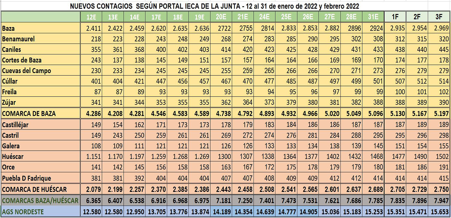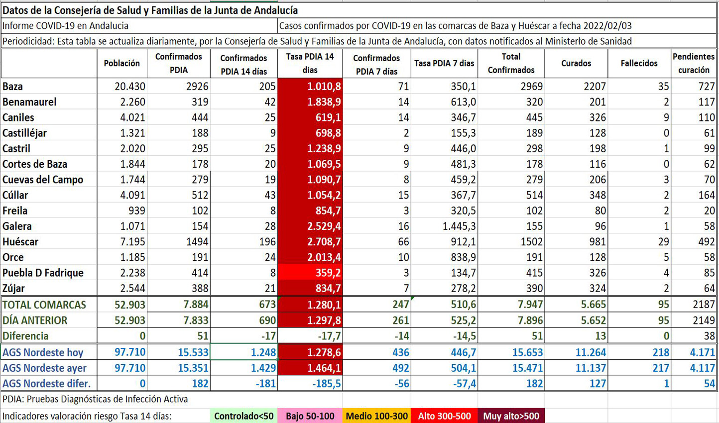 Por lo que se refiere a las comarcas de Baza y Huéscar, el descenso en la tasa de incidencia ha sido más moderado a 14 días, con solo 17,7 casos por 100.000 habitantes que coloca a Baza y Huéscar con casi la misma tasa del AGS, 1.280,1 (1,5 más), tras haberse sumado en este territorio otros 51 contagios y solo haber rebajado en 17 los confirmados a dos semanas.