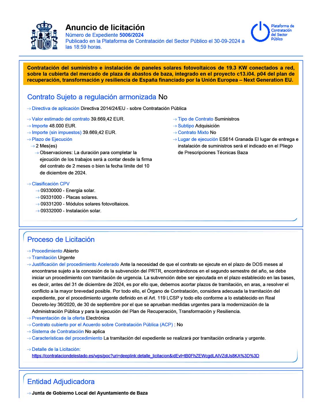 Sale a licitación la contratación del suministro e instalación de paneles solares sobre la cubierta de la Plaza de Abastos. La Plataforma de Contratación del Sector Público ha publicado la licitación para el suministro e instalación de paneles solares fotovoltaicos de 19,3 KW en la cubierta del Mercado de la Plaza de Abastos de Baza. Esta iniciativa forma parte del proyecto C13.I04.P04, enmarcado en el Plan de Recuperación, Transformación y Resiliencia de España, financiado por la Unión Europea a través del fondo Next Generation EU.