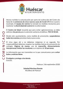 Huéscar reacciona ante la situación provocada por cinco positivos en Covid-19. El Centro de Salud de Huéscar ha sido muy proactivo desde el inicio de la pandemia dando información actualizada a los vecinos de esta comarca del norte de Granada para que no se confíen ante la presencia del coronavirus. En las últimas semanas se han dado varios casos de Covid-19 en el municipio oscense y este miércoles el Ayuntamiento ha informado de que hay cinco nuevos positivos PCR confirmados por las fuentes sanitarias.