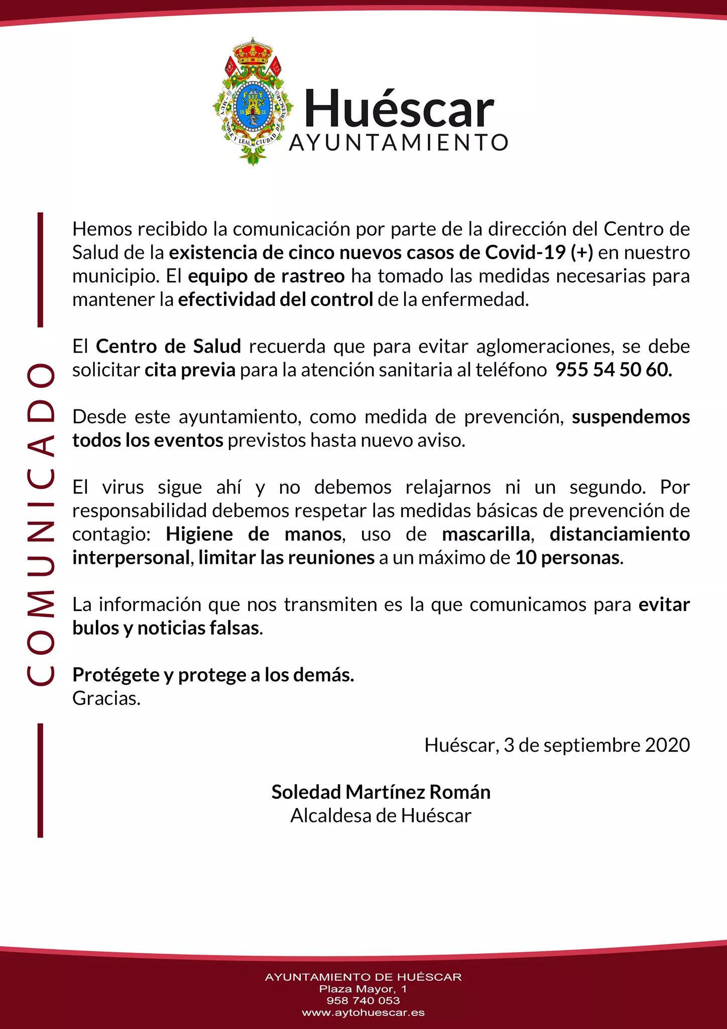«El virus sigue ahí y no podemos relajarnos ni un segundo», concluyen desde el Ayuntamiento de Huéscar, además de recordar que se deben respetar las medidas básicas de prevención de contagio como la higiene de manos, el uso de la mascarilla, el distanciamiento interpersonal o limitar las reuniones a un máximo de diez personas. Igualmente, se hace un llamamiento a la población a que no se transmitan bulos ni noticias falsas y a que se intente buscar la información oficial.