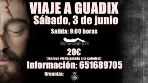 La Cofradía del Cristo de los Méndez organiza un viaje a Guadix para visitar “The Mystery Man”. El próximo sábado 3 de junio, la Real Cofradía del Stmo. Cristo de los Méndez organiza un viaje a Guadix para visitar la exposición de The Mystery Man y también a la Catedral accitana, ambas serán guiadas. Tras ello, disfrutaremos un rato de convivencia en un restaurante de la vecina ciudad de Guadix. El coste es de 20€, incluye transporte y entrada, el almuerzo se abonaría aparte