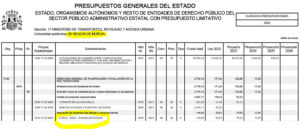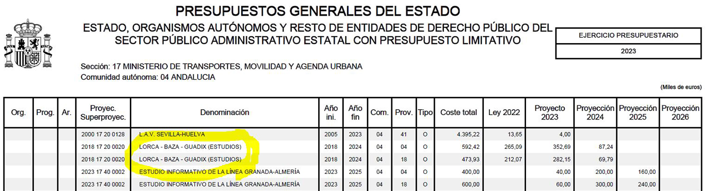 Por otro lado, aparecen dos epígrafes relacionados con los estudios de la línea férrea Lorca – Baza – Guadix, iniciado en 2018 y con fecha de finalización para 2024, cuyo costes totales son de 592.400 y 473.930 euros.