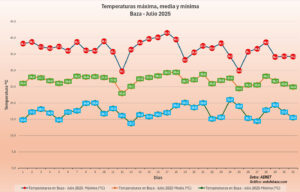 En cuanto a las temperaturas medias, el mes osciló generalmente entre los 25ºC y 29ºC, con un pico de 29,4ºC el 19 de julio. Esta tendencia evidencia un ambiente caluroso sostenido, con noches que en ocasiones no ofrecieron apenas alivio.