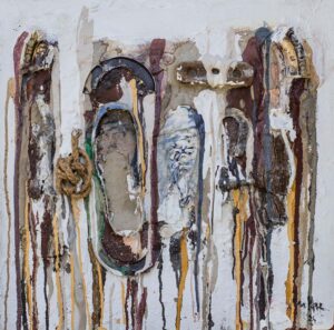 Visualmente sobria, “Memoria” apuesta por una paleta neutra en la que dominan los ocres, grises y tierras, dejando al rojo —símbolo de la violencia— casi ausente, en un gesto deliberado que subraya el tono contemplativo de la muestra.