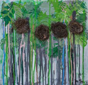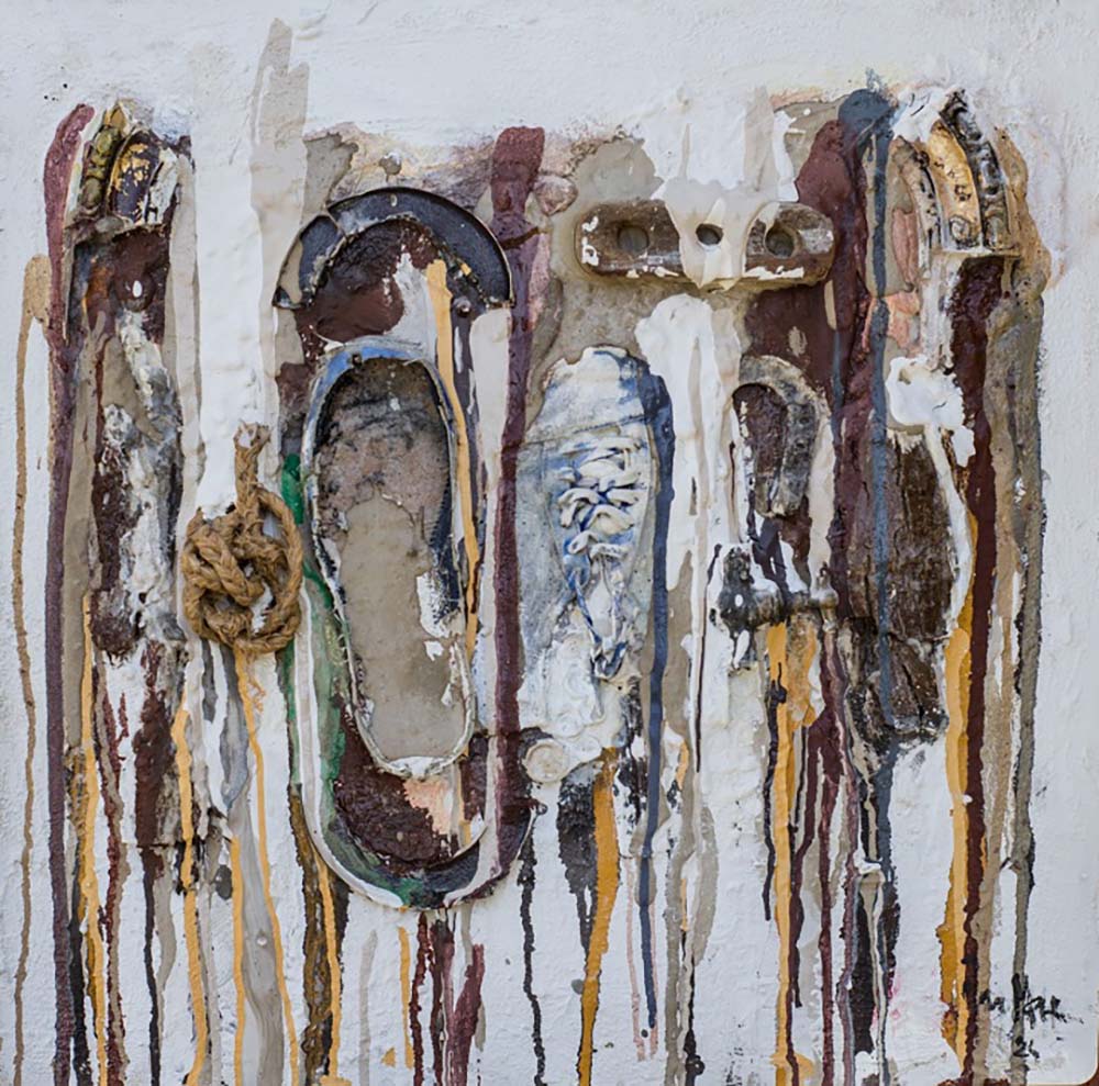 Entre los materiales empleados por el artista destacan elementos reciclados como madera, vidrio, metal o chatarra, que cobran nueva vida en piezas cargadas de simbolismo. Nidos vacíos, vigas rotas y estructuras descompuestas forman un paisaje donde el dolor se transforma en reflexión, y donde la reconstrucción se convierte en acto poético.