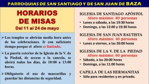 Las Iglesias de Santiago, San Juan y Ntra. Sra. de la Piedad se abrirán al culto público permitiendo la asistencia de fieles, mientras que en la Capilla de las Hermanitas se celebrará la Eucaristía diaria, pero solo para los residentes.