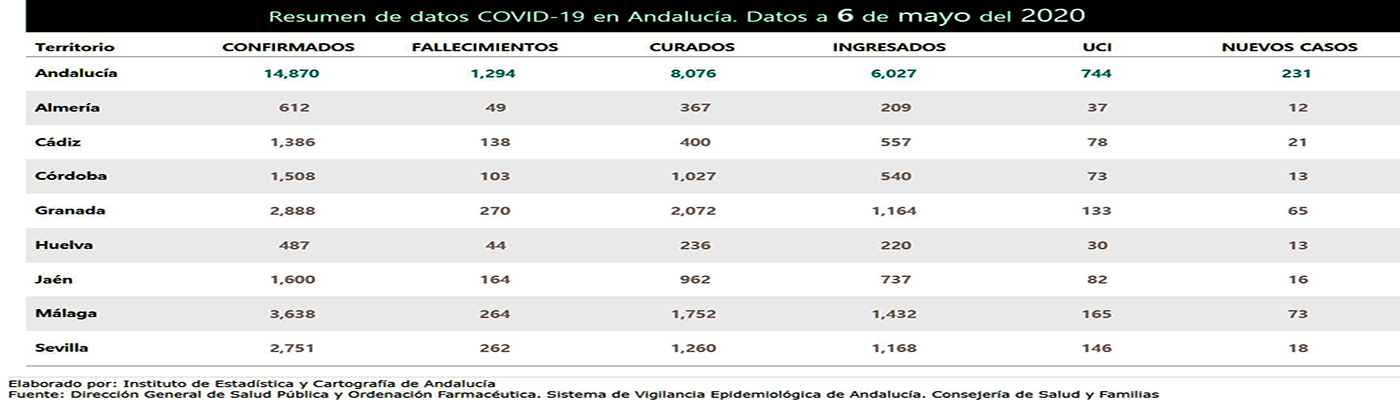 La Consejería Salud y Familias informa del aumento de 45 nuevos casos de Coronavirus en las últimas horas en Andalucía. Así se refleja en el comunicado del Coronavirus de fecha 7 de mayo 2020, en el que la Consejería Salud y Familias informa que se han confirmado en Andalucía 231 nuevos casos de Coronavirus en las últimas horas, por lo que el número total de afectados en nuestra Comunidad asciende a 14.870.