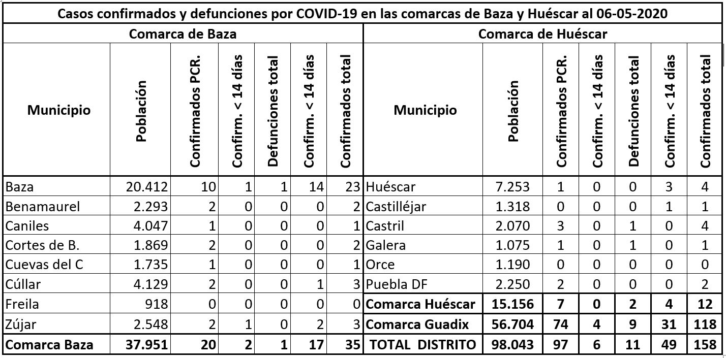 Comentar también que, a partir de hoy, modificamos la información de las comarcas de Baza y Huéscar, ampliándola con los datos generales del Distrito Sanitario, en el resumen final del cuadro que exponemos a continuación, con nuevos parámetros, un subtotal para las comarcas de Baza y de Huéscar y las cifras globales del Distrito Sanitario al que pertenecemos.