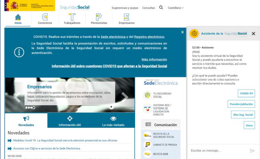 Se trata de un nuevo canal, disponible a cualquier hora los 365 días del año, que se suma a los ya habituales y refuerza las medidas extraordinarias que la Seguridad Social está adoptando para mitigar el impacto del cierre de la atención presencial en las oficinas ante la pandemia provocada por la COVID-19. Entre febrero y abril, las consultas en la página web de la Seguridad Social se han disparado casi un 60%.