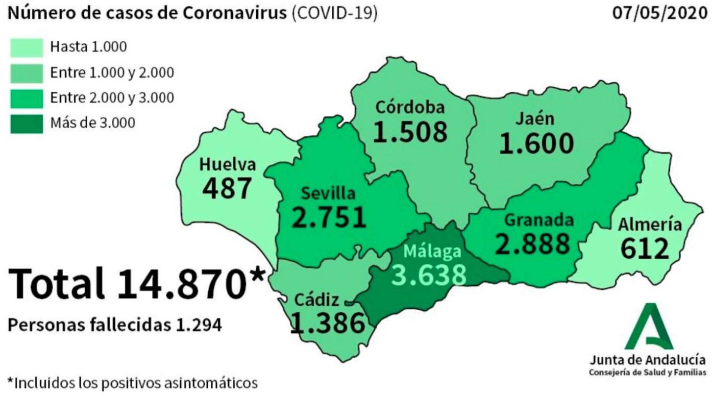 La Consejería Salud y Familias informa del aumento de 45 nuevos casos de Coronavirus en las últimas horas en Andalucía. Así se refleja en el comunicado del Coronavirus de fecha 7 de mayo 2020, en el que la Consejería Salud y Familias informa que se han confirmado en Andalucía 231 nuevos casos de Coronavirus en las últimas horas, por lo que el número total de afectados en nuestra Comunidad asciende a 14.870.