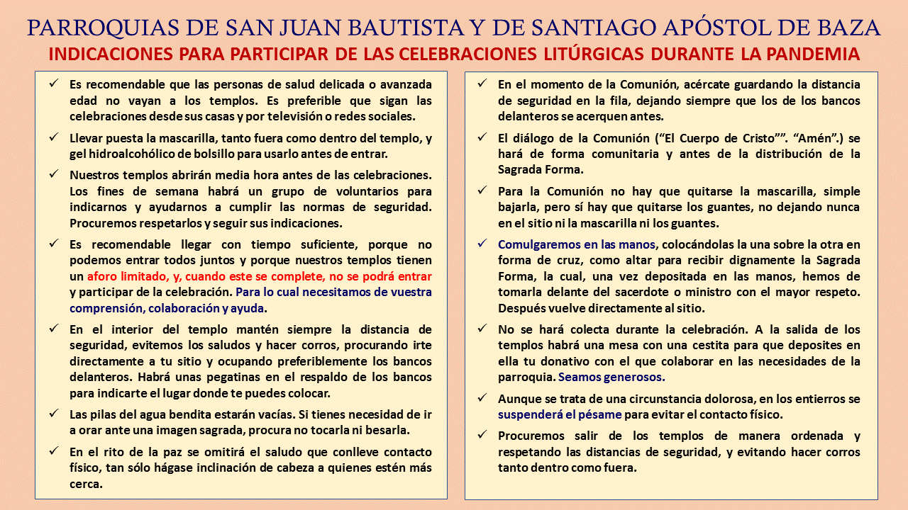Habrá que tener en cuenta que las personas y grupos de riesgo no deben de asistir a los templos y quedan dispensados del precepto de asistencia dominical, pudiendo seguir las celebraciones por televisión o por las redes sociales, pues a través del perfil de Facebook del Párroco, se continuará retransmitiendo en directo todos los días, a las 18:30 h.