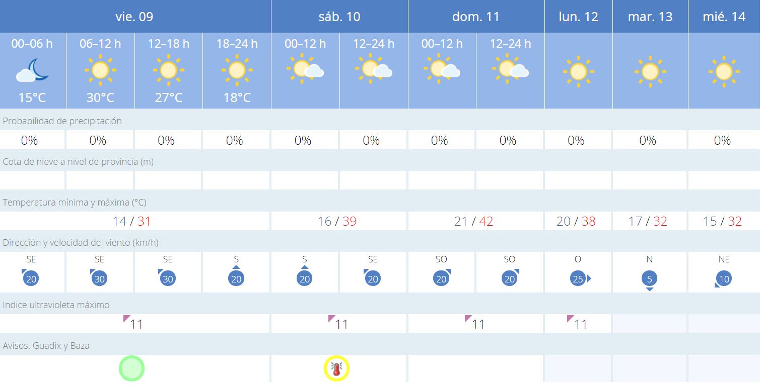 La máxima prevista para hoy de 31ºC será de 39ºC para mañana y de 42ºC el domingo. Ahora sí que llega el verano más caluroso, tras una jornada en la que hoy viernes podremos disfrutaren Baza de un tiempo “fresquito”, algo que mañana habrá supuesto un cambio radical, con un ascenso de temperaturas máximas de 8ºC, que serán tres más el domingo, cuando se espera una máxima de 42ºC.